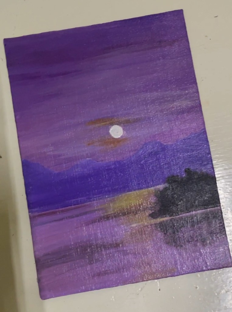 With each brushstroke, I allowed myself to surrender to the flow of inspiration, embracing the serendipity of the moment. As the colors mingled and merged on the canvas, I had a hard time trying to recreate the perfect image that was in my head. What started as a simple act of repurposing transformed into a journey of discovery—a reminder of the magic that can unfold when we allow ourselves to embrace the unexpected. In this painting, I found not only a reflection of the beauty of nature but also a testament to the power of spontaneity in the creative process.